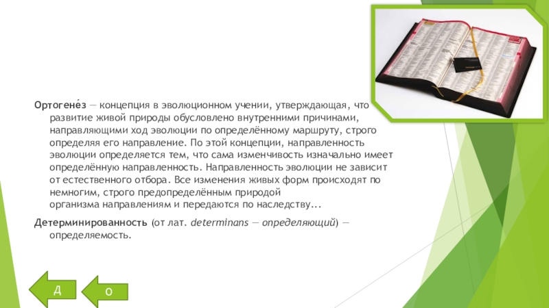 Слайд 27Ортогене́з — концепция в эволюционном учении, утверждающая, что развитие живой природы обусловлено внутренними причинами, направляющими ход эволюции по определённому маршруту,
