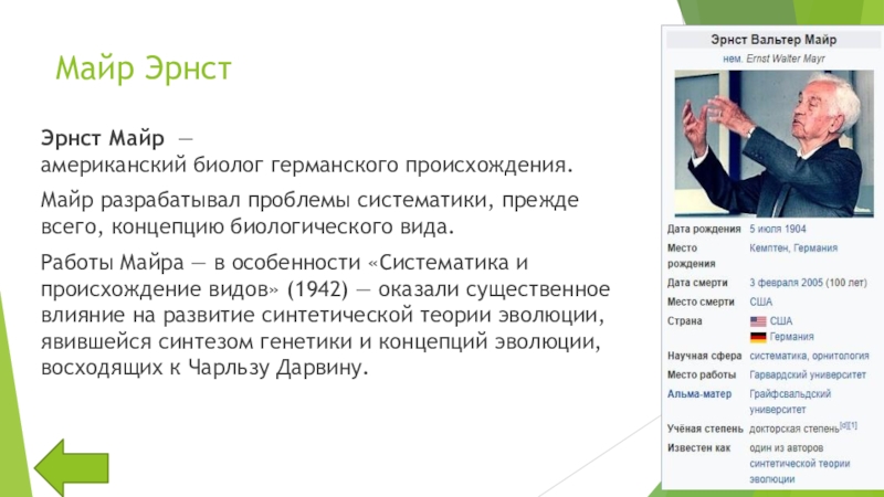 в особенности «Систематика и происхождение видов» (1942) — оказали существенное влияние на развитие синтетической теории эволюции, явившейся синтезом генетики и концепций эволюции, восходящих к Чарльзу Дарвину.