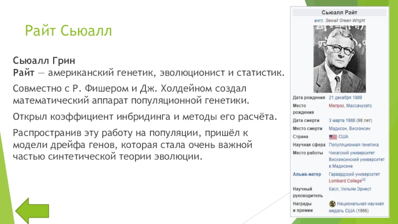 Сьюалл Грин Райт — американский генетик, эволюционист и статистик.