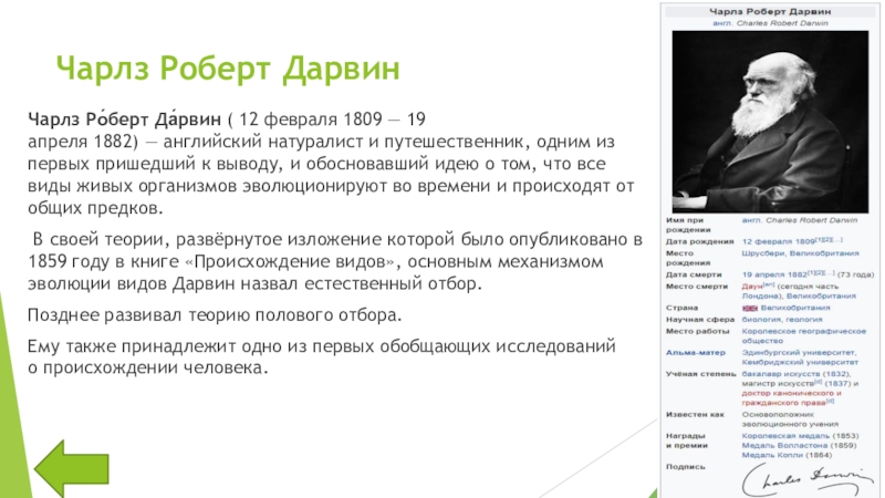 пришедший к выводу, и обосновавший идею о том, что все виды живых организмов эволюционируют во времени и происходят от общих предков.