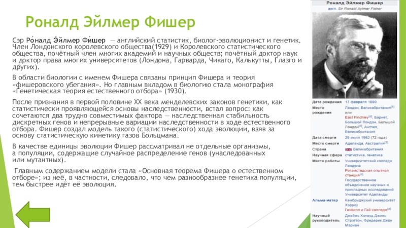 Сэр Ро́налд Э́йлмер Фи́шер — английский статистик, биолог-эволюционист и генетик. Член Лондонского королевского общества(1929) и Королевского статистического общества,