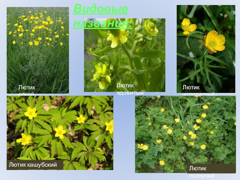 Лютик едкийЛютик ядовитыйЛютик золотистыйЛютик ползучийЛютик кашубскийВидовые названия: