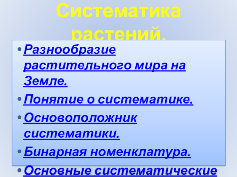 Систематика растений.Разнообразие растительного мира на Земле.Понятие о систематике.Основоположник систематики.Бинарная номенклатура.Основные систематические категории растений.