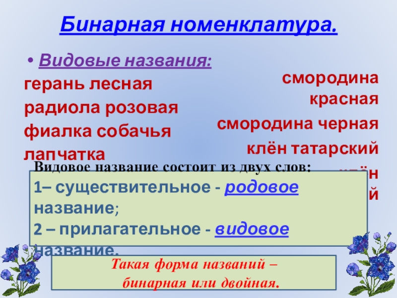 Бинарная номенклатура. Видовые названия:герань леснаярадиола розоваяфиалка собачьялапчатка прямостоячаясмородина краснаясмородина чернаяклён татарскийклён остролистныйВидовое название состоит из двух слов:1–