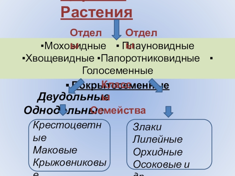 Царство Растения     Двудольные      Однодольные▪Моховидные  ▪ Плауновидные