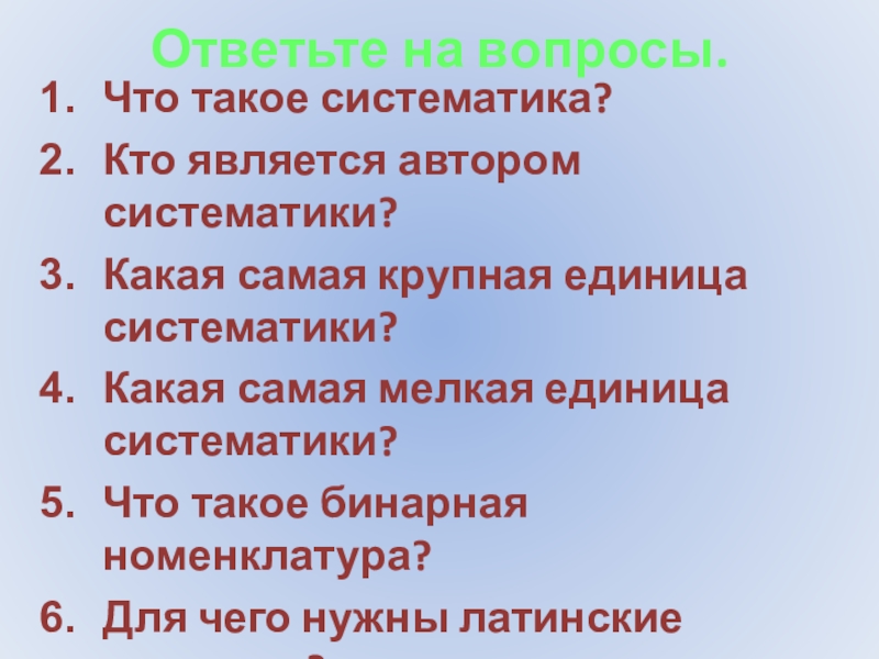 Ответьте на вопросы.Что такое систематика?Кто является автором систематики?Какая самая крупная единица систематики?Какая самая мелкая единица систематики?Что такое