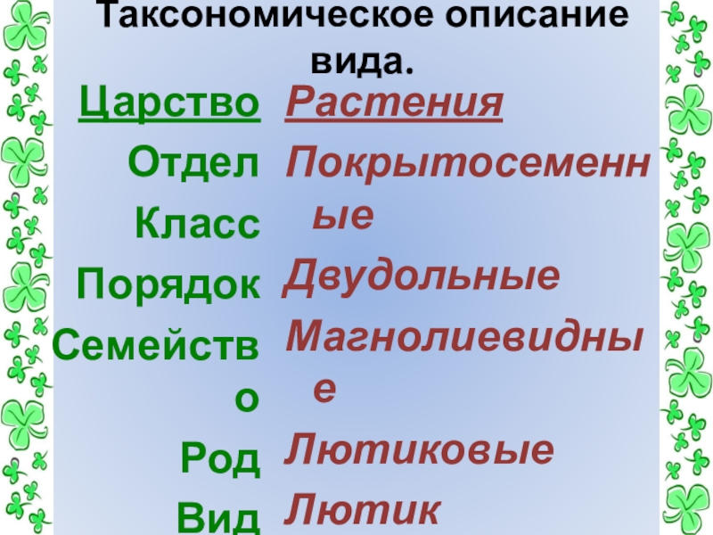 Таксономическое описание вида.Царство ОтделКлассПорядокСемействоРодВидРастенияПокрытосеменныеДвудольныеМагнолиевидныеЛютиковыеЛютикЛютик едкий