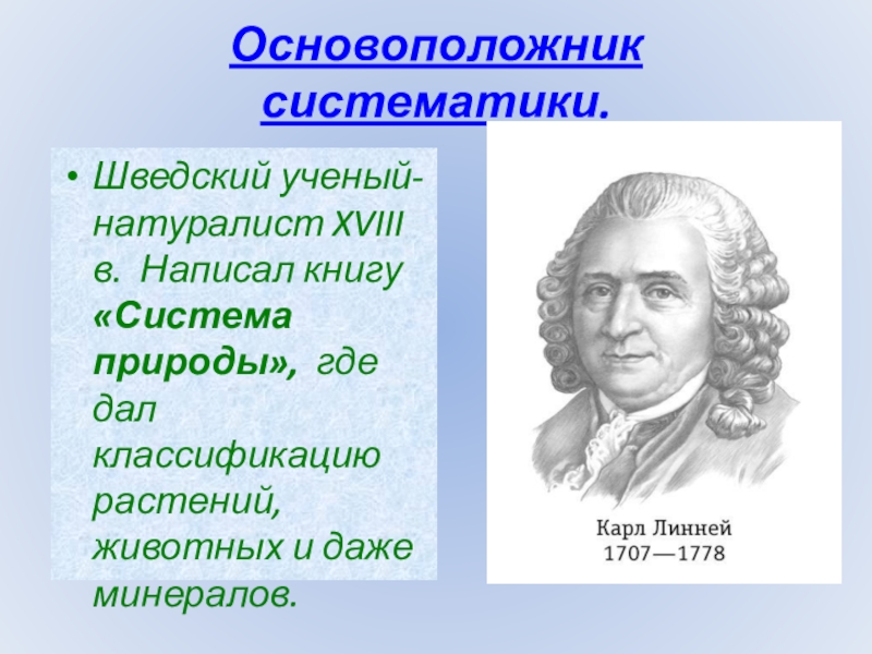Основоположник систематики. Шведский ученый-натуралист XVIII в. Написал книгу «Система природы», где дал классификацию растений, животных и даже