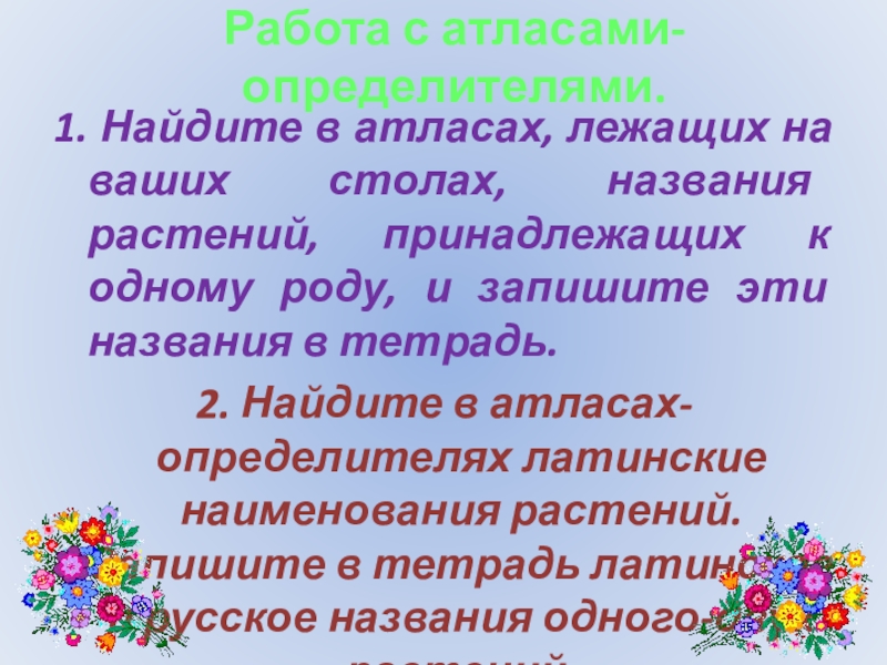 Работа с атласами-определителями.1. Найдите в атласах, лежащих на ваших столах, названия растений, принадлежащих к одному роду, и