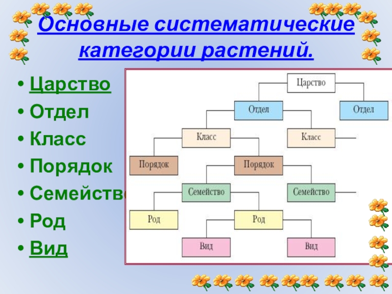 Основные систематические категории растений.Царство ОтделКлассПорядокСемействоРодВид
