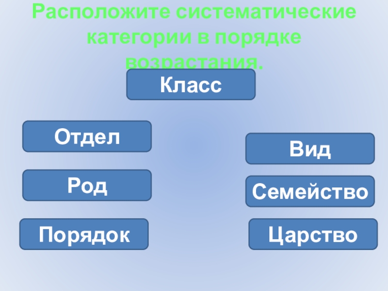 Слайд 15Расположите систематические категории в порядке возрастания.
