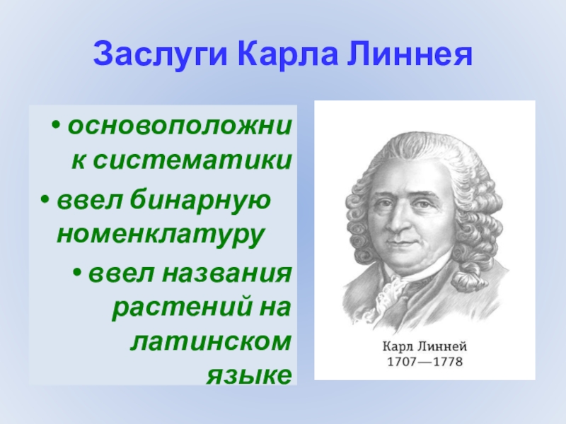 Заслуги Карла Линнеяосновоположник систематикиввел бинарную номенклатуруввел названия растений на латинском языке