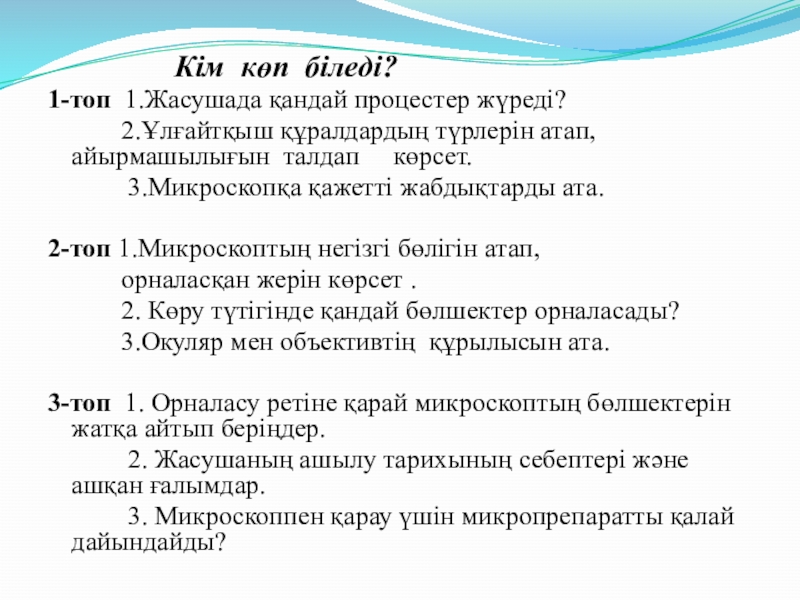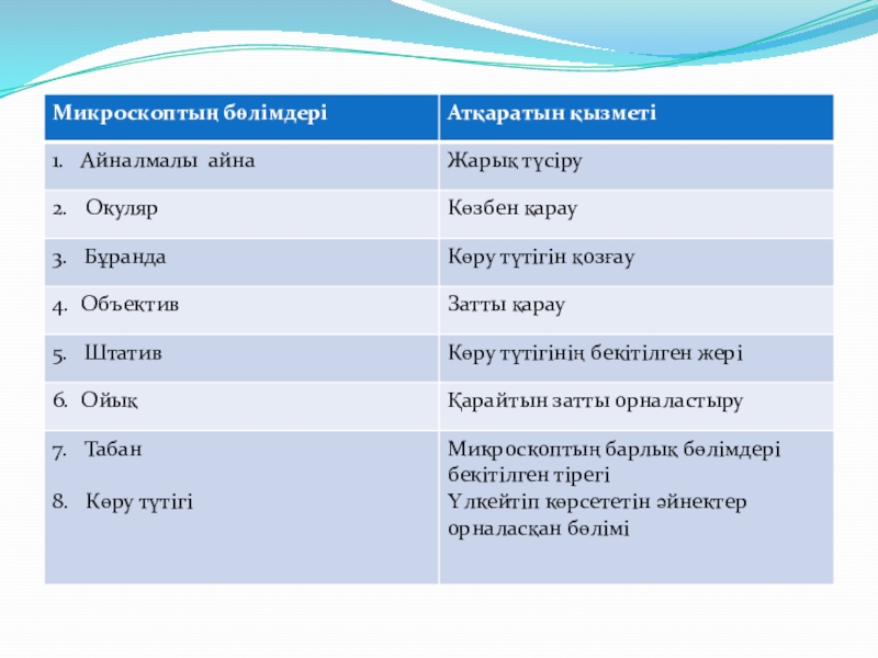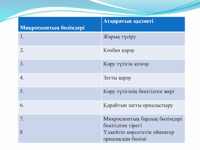 3-топ 1. Орналасу ретіне қарай микроскоптың бөлшектерін жатқа айтып беріңдер.