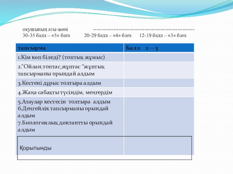 30-35 балл – «5» баға 20-29 балл – «4» баға 12-19 балл – «3» баға