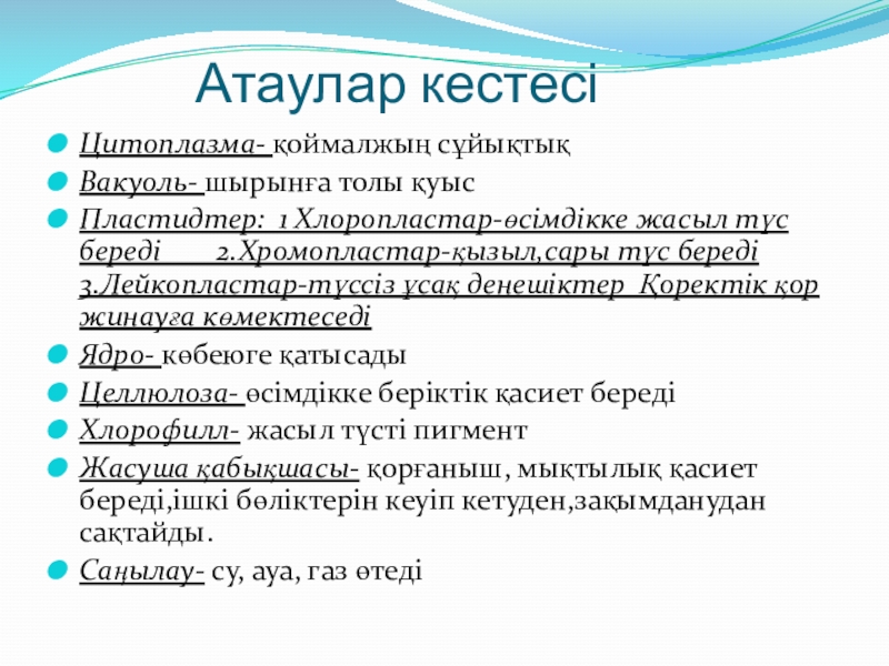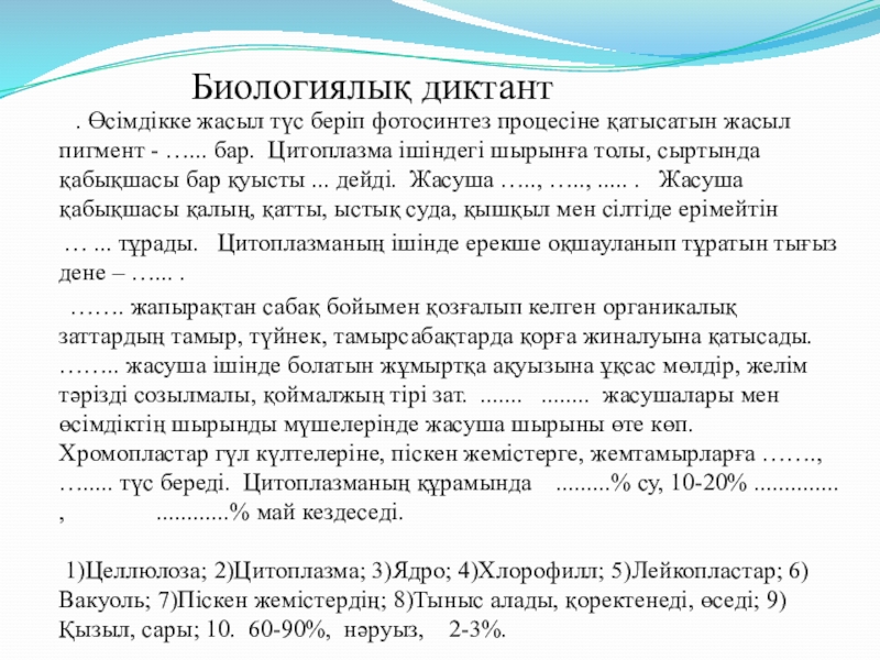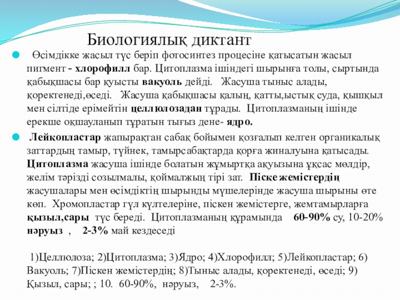 1)Целлюлоза; 2)Цитоплазма; 3)Ядро; 4)Хлорофилл; 5)Лейкопластар; 6)Вакуоль; 7)Піскен жемістердің; 8)Тыныс алады, қоректенеді, өседі; 9)Қызыл, сары; ; 10. 60-90%, нәруыз, 2-3%.