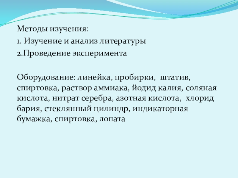 раствор аммиака, йодид калия, соляная кислота, нитрат серебра, азотная кислота, хлорид бария, стеклянный цилиндр, индикаторная бумажка, спиртовка, лопата