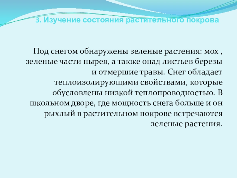 зеленые части пырея, а также опад листьев березы и отмершие травы. Снег обладает теплоизолирующими свойствами, которые обусловлены низкой теплопроводностью. В школьном дворе, где мощность снега больше и он рыхлый в растительном покрове встречаются зеленые растения.