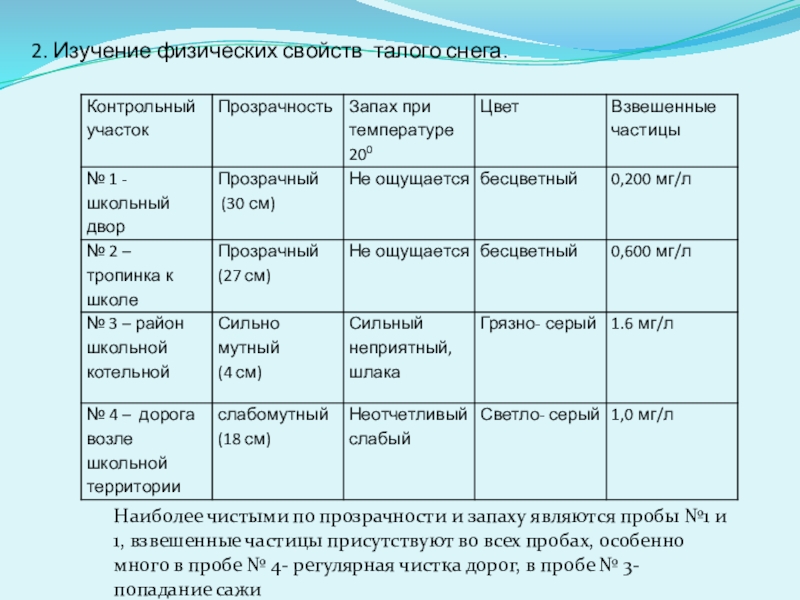 являются пробы №1 и 1, взвешенные частицы присутствуют во всех пробах, особенно много в пробе № 4- регулярная чистка дорог, в пробе № 3- попадание сажи