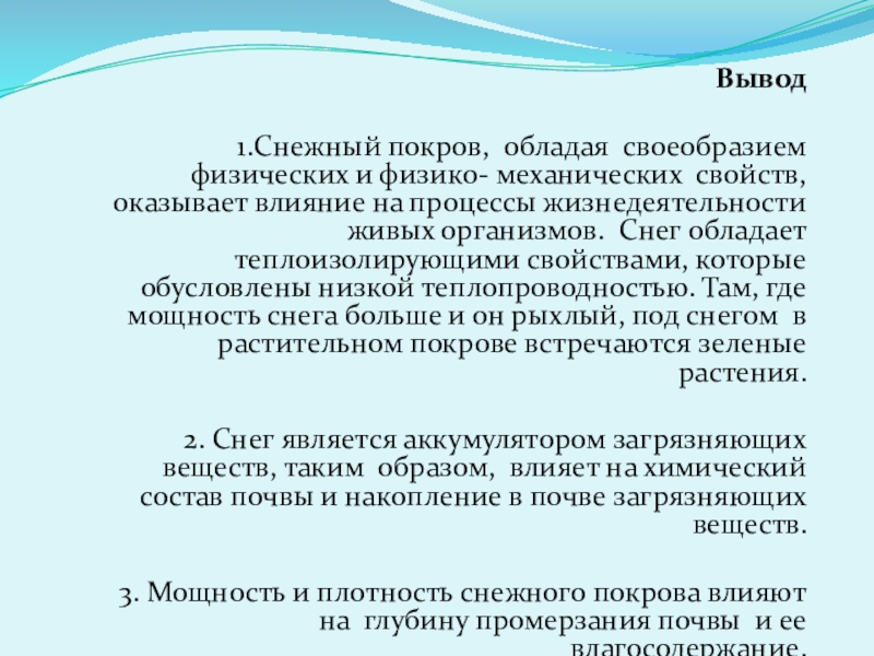 2. Снег является аккумулятором загрязняющих веществ, таким образом, влияет на химический состав почвы и накопление в почве загрязняющих веществ.