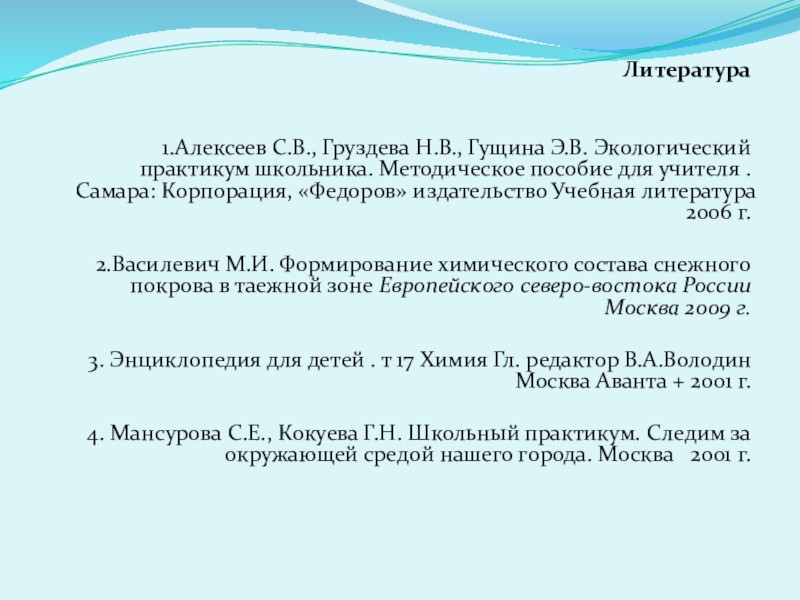 4. Мансурова С.Е., Кокуева Г.Н. Школьный практикум. Следим за окружающей средой нашего города. Москва 2001 г.