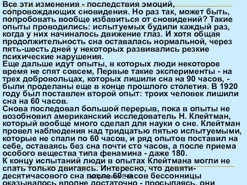 по восемь суток. К концу опыта у них появлялись психические расстройства, галлюцинации, видения, они пытались заснуть в любой обстановке.