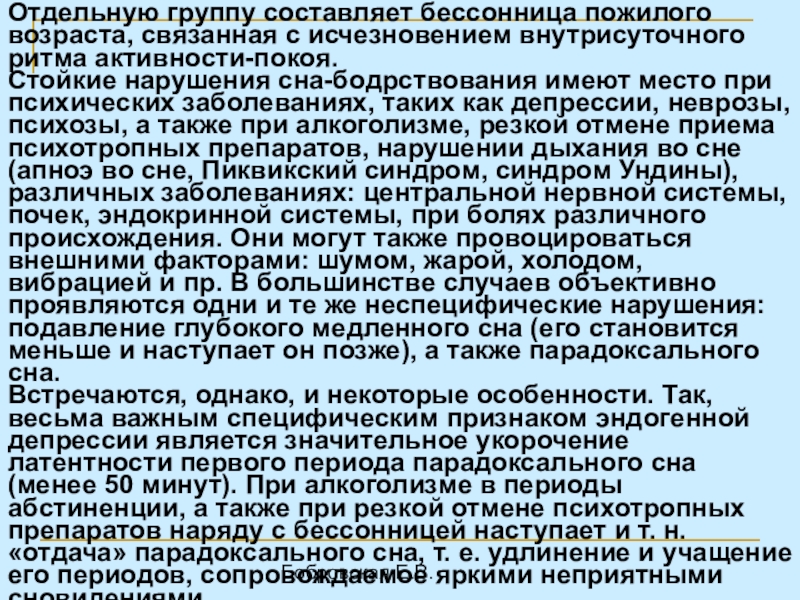 Встречаются, однако, и некоторые особенности. Так, весьма важным специфическим признаком эндогенной депрессии является значительное укорочение латентности первого периода парадоксального сна (менее 50 минут). При алкоголизме в периоды абстиненции, а также при резкой отмене психотропных препаратов наряду с бессонницей наступает и т. н. «отдача» парадоксального сна, т. е. удлинение и учащение его периодов, сопровождаемое яркими неприятными сновидениями.