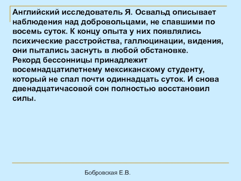 Английский исследователь Я. Освальд описывает наблюдения над добровольцами, не спавшими