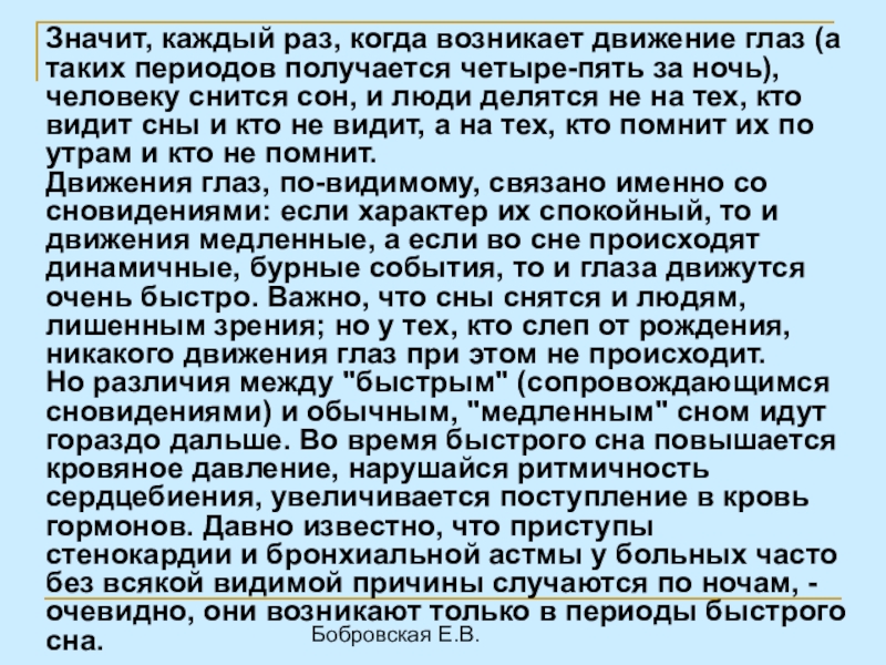 Движения глаз, по-видимому, связано именно со сновидениями: если характер их спокойный, то и движения медленные, а если во сне происходят динамичные, бурные события, то и глаза движутся очень быстро. Важно, что сны снятся и людям, лишенным зрения; но у тех, кто слеп от рождения, никакого движения глаз при этом не происходит.