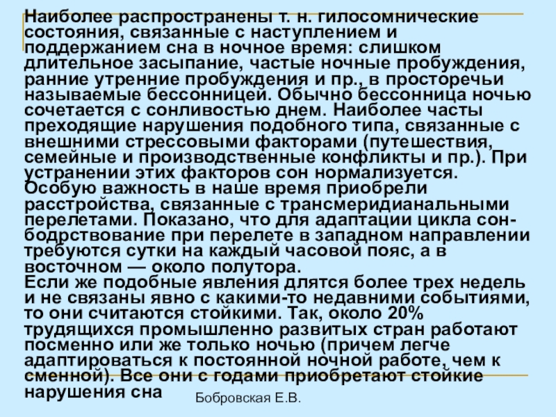 поддержанием сна в ночное время: слишком длительное засыпание, частые ночные пробуждения, ранние утренние пробуждения и пр., в просторечьи называемые бессонницей. Обычно бессонница ночью сочетается с сонливостью днем. Наиболее часты преходящие нарушения подобного типа, связанные с внешними стрессовыми факторами (путешествия, семейные и производственные конфликты и пр.). При устранении этих факторов сон нормализуется.