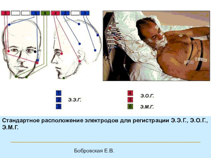 Стандартное расположение электродов для регистрации Э.Э.Г., Э.О.Г., Э.М.Г.