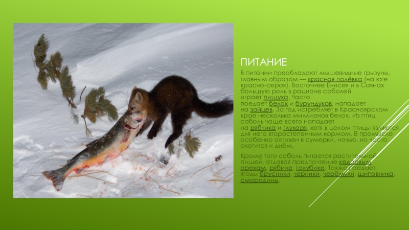 Кроме того соболь питается растительной пищей, отдавая предпочтение кедровым орехам, рябине, голубике. Также поедает ягоды брусники, черники, черёмухи, шиповника, смородины.