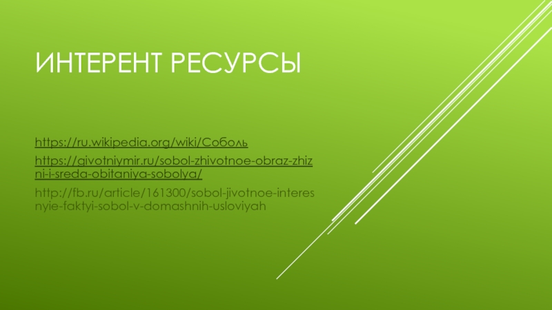 ИНТЕРЕНТ РЕСУРСЫhttps://ru.wikipedia.org/wiki/Собольhttps://givotniymir.ru/sobol-zhivotnoe-obraz-zhizni-i-sreda-obitaniya-sobolya/http://fb.ru/article/161300/sobol-jivotnoe-interesnyie-faktyi-sobol-v-domashnih-usloviyah