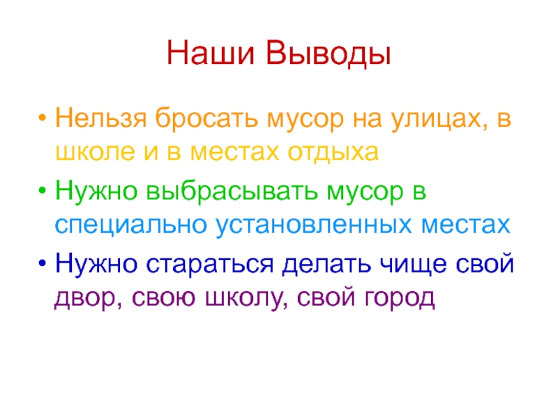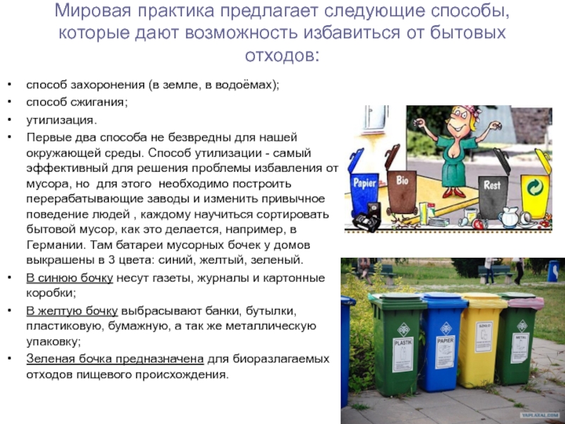 Первые два способа не безвредны для нашей окружающей среды. Способ утилизации - самый эффективный для решения проблемы избавления от мусора, но для этого необходимо построить перерабатывающие заводы и изменить привычное поведение людей , каждому научиться сортировать бытовой мусор, как это делается, например, в Германии. Там батареи мусорных бочек у домов выкрашены в 3 цвета: синий, желтый, зеленый.
