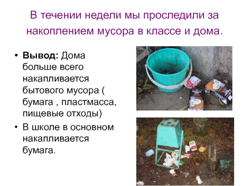 Вывод: Дома больше всего накапливается бытового мусора ( бумага , пластмасса, пищевые отходы)