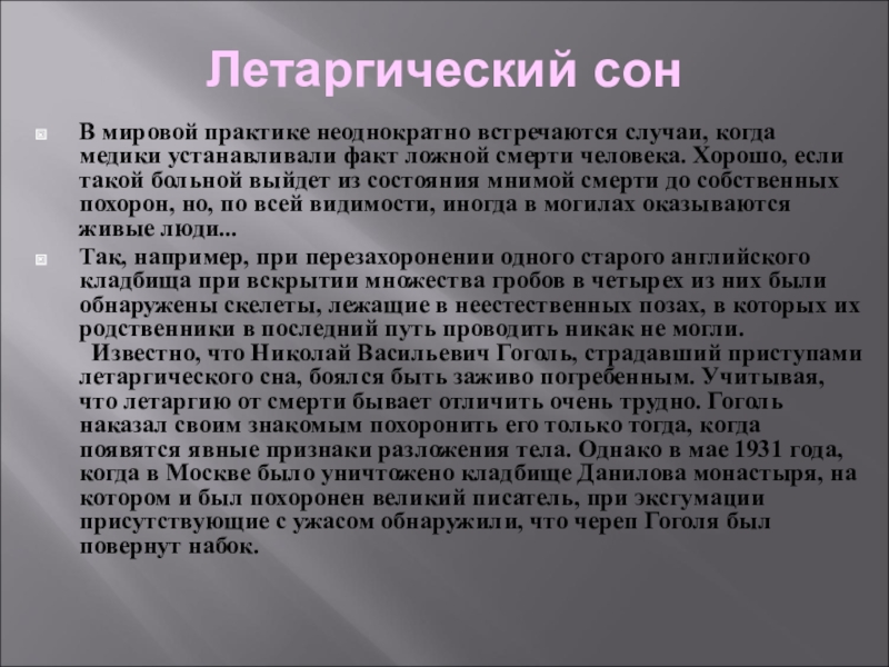 ЛЕТАРГИЯ - от греческого "лете" (забвение) и "аргия" (бездействие).