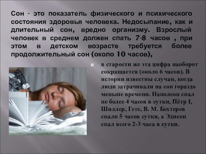 в старости же эта цифра наоборот сокращается (около 6 часов). В истории известны случаи, когда люди затрачивали на сон гораздо меньше времени. Наполеон спал не более 4 часов в сутки, Пётр I, Шиллер, Гете, В. М. Бехтерев спали 5 часов сутки, а Эдисон спал всего 2-3 часа в сутки.