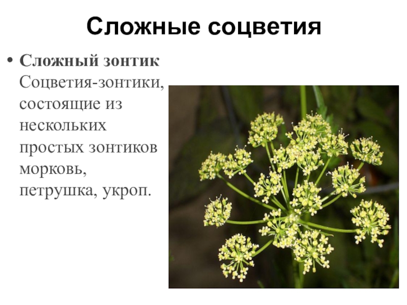 Сложные соцветияСложный зонтик  Соцветия-зонтики, состоящие из нескольких простых зонтиков  морковь, петрушка, укроп.
