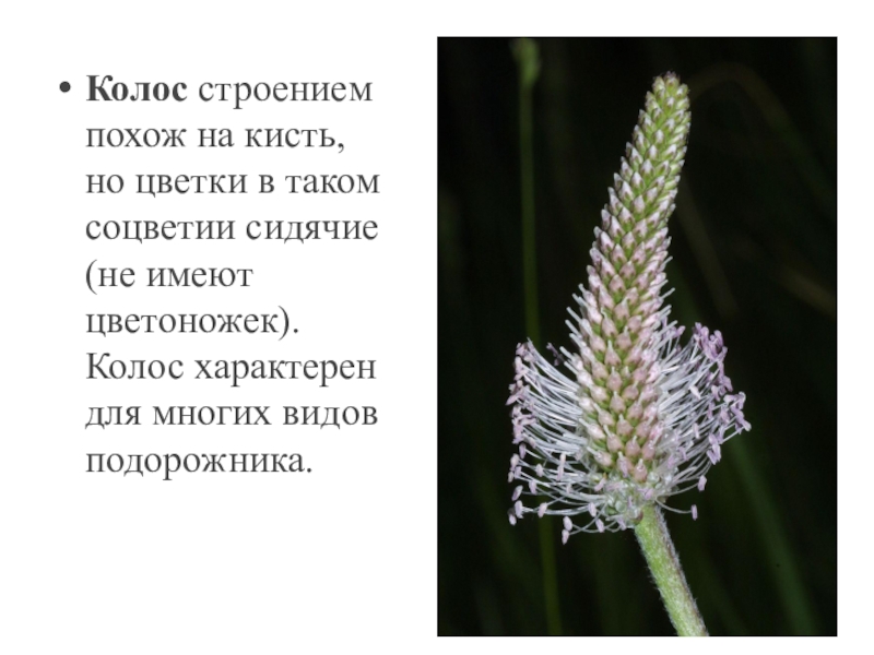 Слайд 6Колос строением похож на кисть, но цветки в таком соцветии сидячие