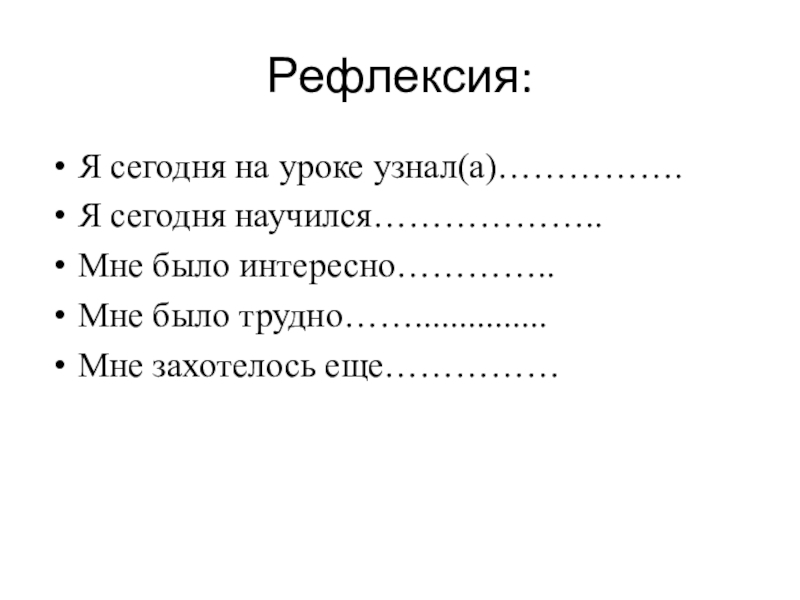 Рефлексия:Я сегодня на уроке узнал(а)…………….Я сегодня научился………………..Мне было интересно…………..Мне было трудно……...............Мне захотелось еще……………