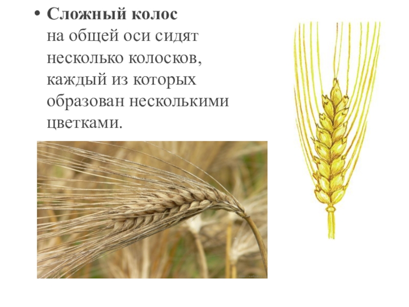 Сложный колос  на общей оси сидят несколько колосков, каждый из которых образован несколькими цветками.