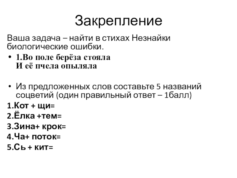 ЗакреплениеВаша задача – найти в стихах Незнайки биологические ошибки.1.Во поле берёза стояла  И её пчела опыляла Из предложенных