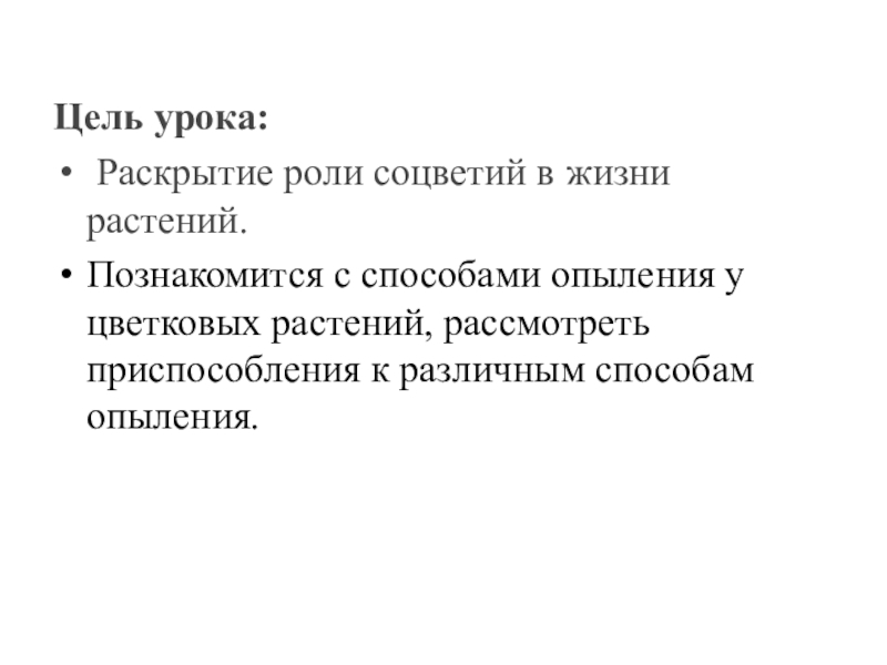 Цель урока: Раскрытие роли соцветий в жизни растений.Познакомится с способами опыления у цветковых растений, рассмотреть приспособления к различным способам опыления.