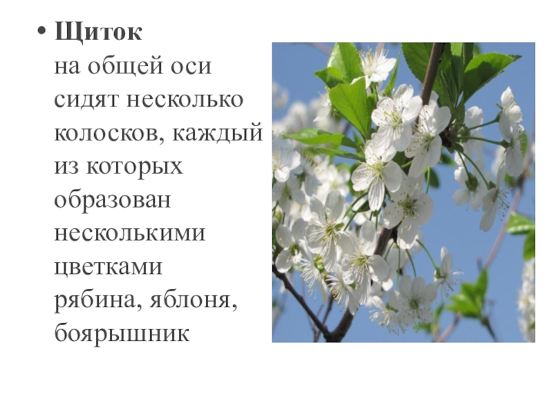 Щиток  на общей оси сидят несколько колосков, каждый из которых образован несколькими цветками  рябина, яблоня, боярышник