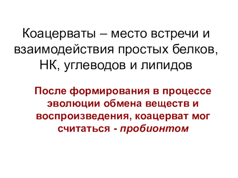 После формирования в процессе эволюции обмена веществ и воспроизведения, коацерват мог считаться - пробионтом