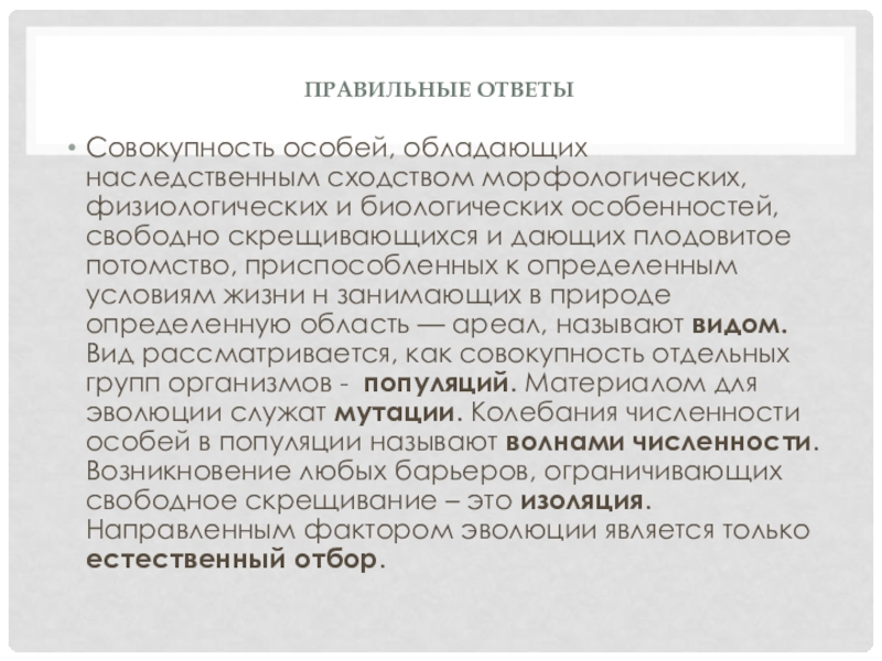 свободно скрещивающихся и дающих плодовитое потомство, приспособленных к определенным условиям жизни н занимающих в природе определенную область — ареал, называют видом. Вид рассматривается, как совокупность отдельных групп организмов - популяций. Материалом для эволюции служат мутации. Колебания численности особей в популяции называют волнами численности. Возникновение любых барьеров, ограничивающих свободное скрещивание – это изоляция. Направленным фактором эволюции является только естественный отбор.