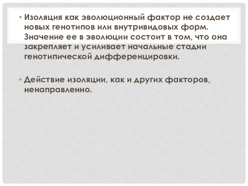 Слайд 28Изоляция как эволюционный фактор не создает новых генотипов или внутривидовых форм.