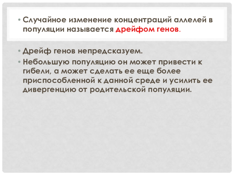 Слайд 23Случайное изменение концентраций аллелей в популяции называется дрейфом генов.