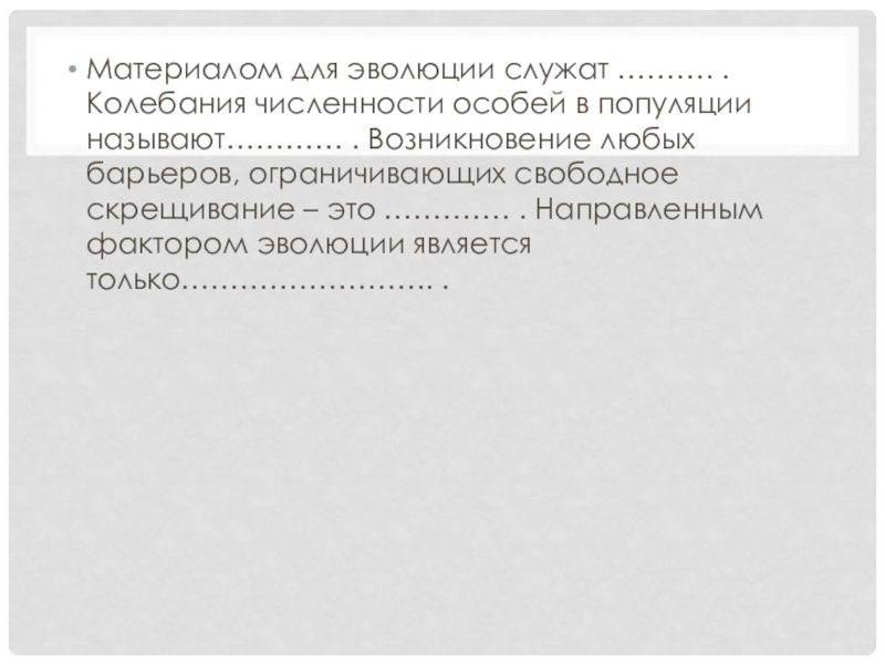 называют………… . Возникновение любых барьеров, ограничивающих свободное скрещивание – это …………. . Направленным фактором эволюции является только…………………….. .