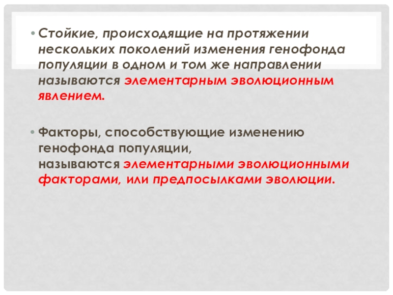 Слайд 15Стойкие, происходящие на протяжении нескольких поколений изменения генофонда популяции в одном