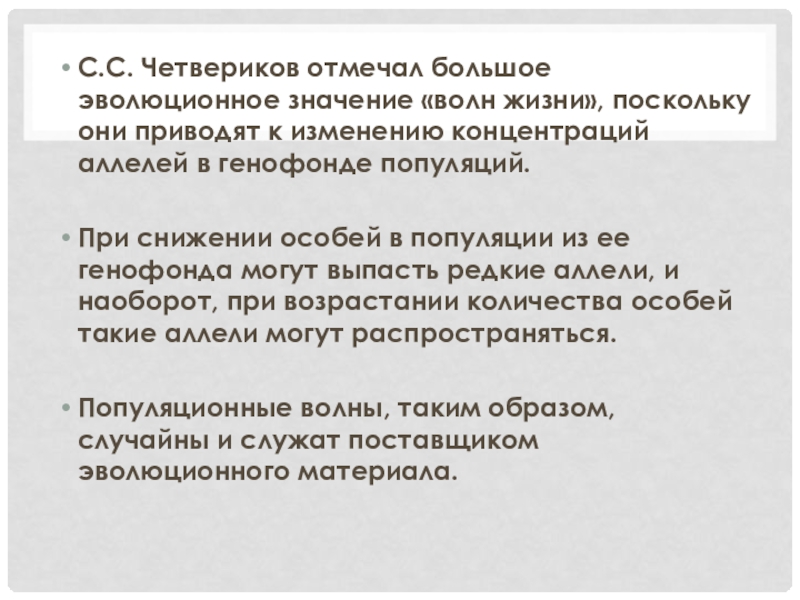 Слайд 22С.С. Четвериков отмечал большое эволюционное значение «волн жизни», поскольку они приводят